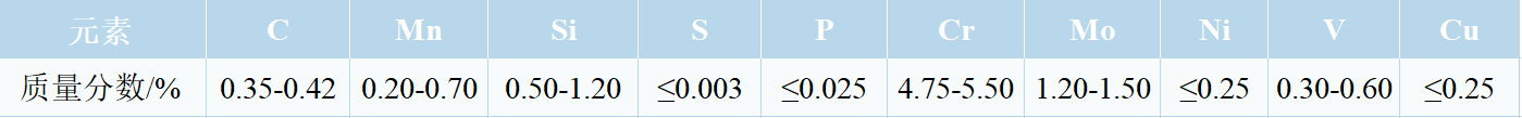 4Cr5MoSiV相当于国外的H11钢,有较强的二次硬化效应,属高韧性热稳定性钢,是国内外应用比较广泛的 Cr-Mo-V 系热作模具钢之一。该钢在在中温(≤600 ℃)条件下具有优良的强度、韧性、耐磨性、热稳定性以及抗冷热疲劳性能等, 能有效抵抗温度循环交变引起的热疲劳裂纹的产生和扩展,综合性能优异。