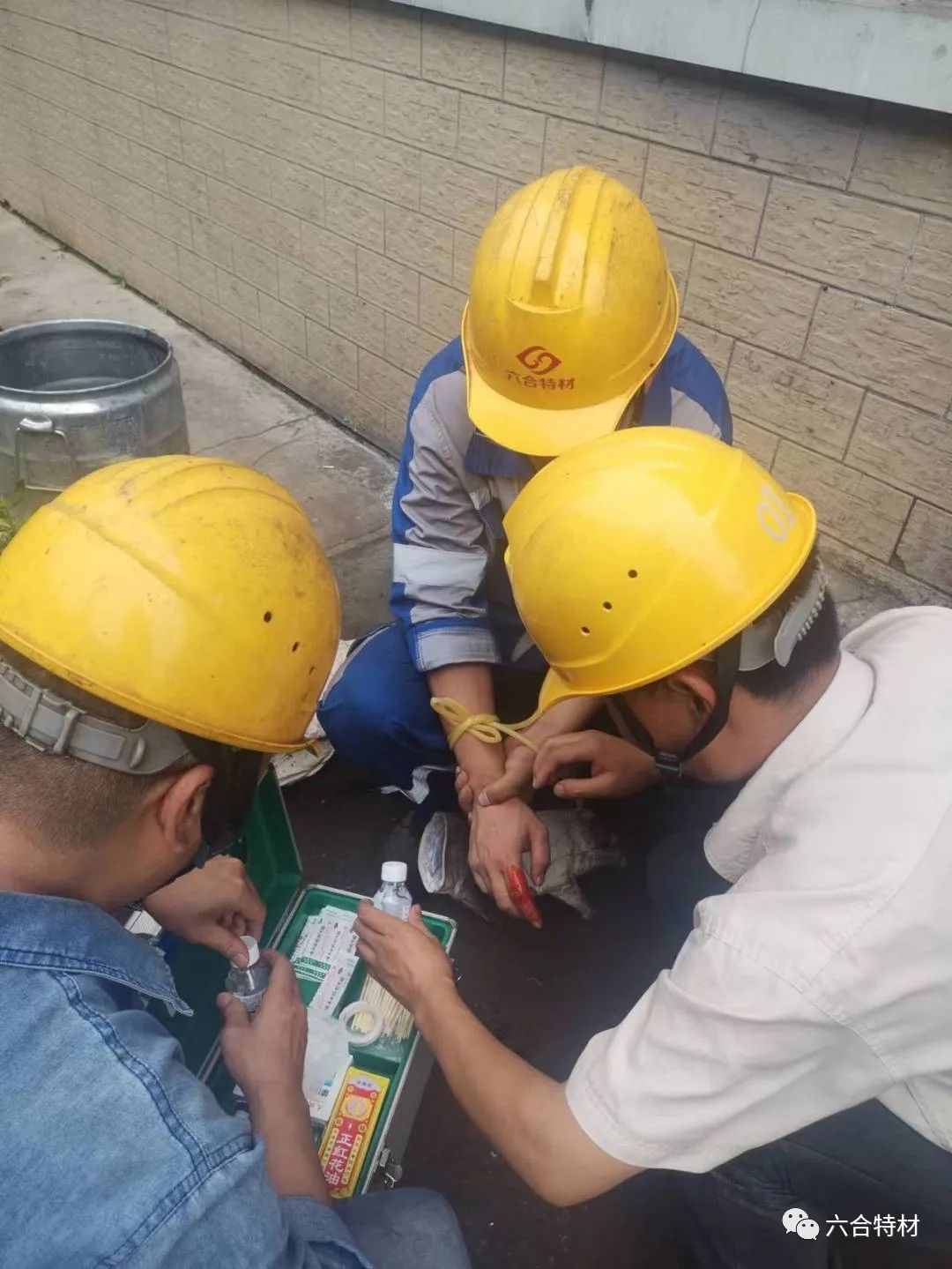 演练模拟岗位员工在进行探伤、表面检查作业时,不小心被钢材挤压到手指导致受伤。在现场的操作人员发现后,立即通知安全环保部组织救护,待人员赶到事故现场后迅速将伤员从现场救出,扶至空旷场地,由现场人员对伤者进行简单包扎后并送至医院。