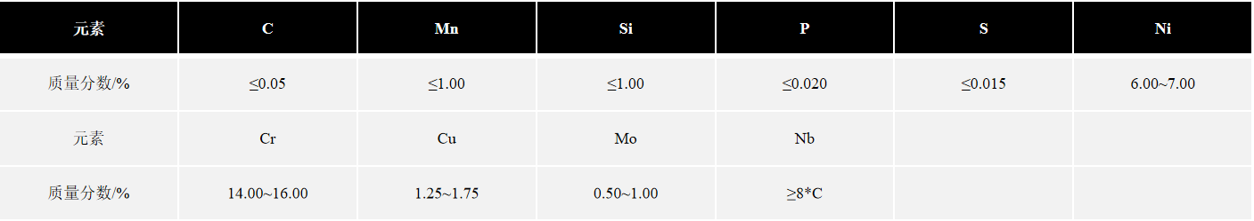 04Cr15Ni7Cu2MoNbVN是 Cr-Ni-Cu-Mo-Nb 低碳马氏体沉淀硬化型不锈钢,主要以低碳马氏体相变强化、碳化物及金属间化合物析出强化,其机械性能主要取决于时效温度。该合金具有非常好的耐腐蚀性能(类似于304不锈钢),具有中等强度(类似于410型不锈钢),650℃下具有优异的抗氧化性,具有良好的可加工性、可焊性。