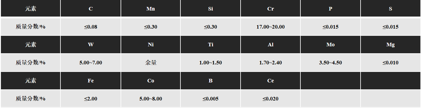 GH4099是Ni-Cr基沉淀硬化变形高温合金,长期工作温度在900°C以下,短时使用可达1000℃。合金 中加入W、Mo、Cr和Co等元素进行固溶强化,加入Al、Ti等元素形成γ' 沉淀强化相,加入微量B和Ce、Mg元素进行晶界强化,综合强化效果明显。合金的室温和高温强度、抗氧化性能优异、热加工和焊接性能良好。
