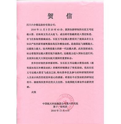 中国航天科技集团第六研究院贺信-六合产品应用于长征五号运载火箭