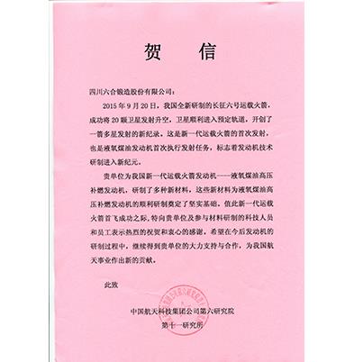 中国航天科技集团第六研究院贺信-六合产品应用于长征六号运载火箭