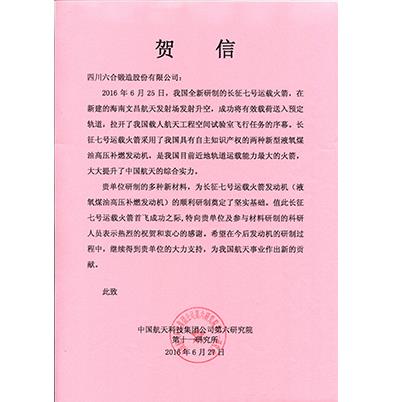 中国航天科技集团第六研究院贺信-六合产品应用于长征七号运载火箭