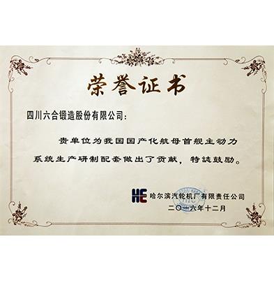 六合产品应用于国产航母首舰荣誉证书