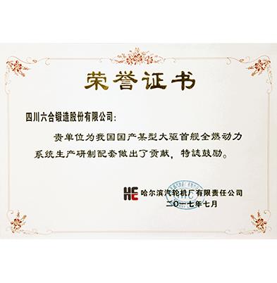 六合产品应用于国产某型大驱首舰荣誉证书